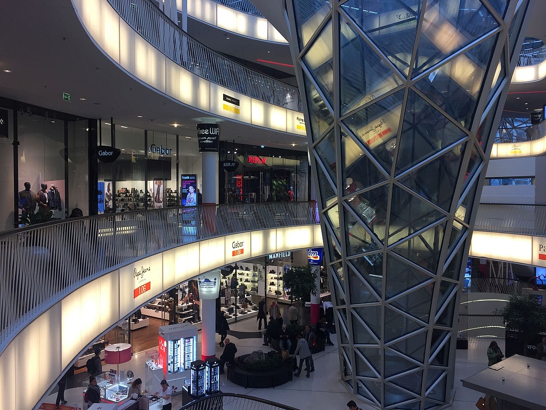 Die heiße Diva unter den Shoppingcentern ist auch die jüngste: das Skyline Plaza im aufstrebenden Europa-Viertel neben der Messe gehört zu meinen persönlichen Lieblingen und wird mittags sehr gern von Berufstätigen aus den umliegenden Büros aufgesucht. Ob es an der abgerundeten, geschwungenen Form liegt, der lichtdurchfluteten Architektur oder an der Auswahl an hippen Läden wie Pull & Bear oder dem spanischen Label Desigual – im Skyline Plaza fühle ich mich einfach wohl. Meine Freundin Olga hat mir auch noch das beliebte Meridian Spa im Obergeschoss unter der edlen Kuppel schmackhaft gemacht – wir gehen über den Dächern der Stadt in die Sauna. Skyline Plaza ganz heiß! Tipp: After-Work in die Sauna über den Dächern der Stadt entspannen, oder auf einen Burger ins Restaurant Alex und auch hinabschauen aufs Europa-Viertel.