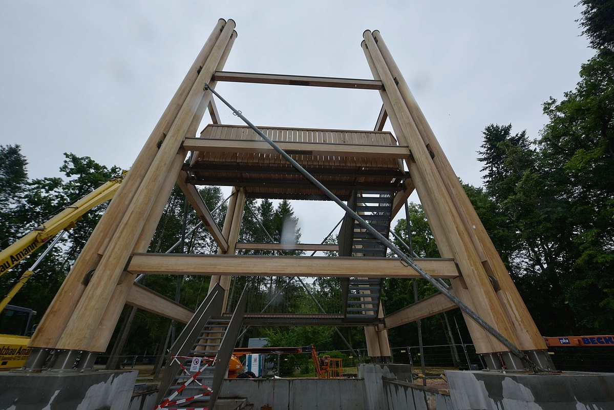 The tower will be 43 meters high when completed - just like the original. This is also in line with the wishes of the people of Frankfurt, who had decided in an online survey directly after the fire with a clear majority for a faithful reconstruction. The concrete foundations have already been completed and will later be clad in sandstone. Visually, the new tower will hardly differ from the original: It has exactly the same height, the characteristic round supports as well as the horizontal and diagonal struts correspond geometrically to the original construction. However, different wood will be used for reasons of durability: Whereas in 1931 around 340 cubic metres of pine, beech and oak from the city forest were used, the new tower is made of sweet chestnut from southern France and northern Spain as well as oak from the Black Forest. The main supporting structure is made of glued laminated timber from sweet chestnut, for which the Hessian Ministry of Economics, Energy, Transport and Regional Development granted individual approval last autumn. Stair treads and landings will be made of oak.