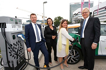 (kus) In Frankfurt's newest district Gateway Gardens, the first fast charging station for electric vehicles opened on Tuesday, August 8, on a property owned by Fraport AG just 300 meters from Frankfurt Airport's Terminal 2. Initiators for this location are the Economic Development Department of the City of Frankfurt, Fraport AG and Grundstücksgesellschaft Gateway Gardens.