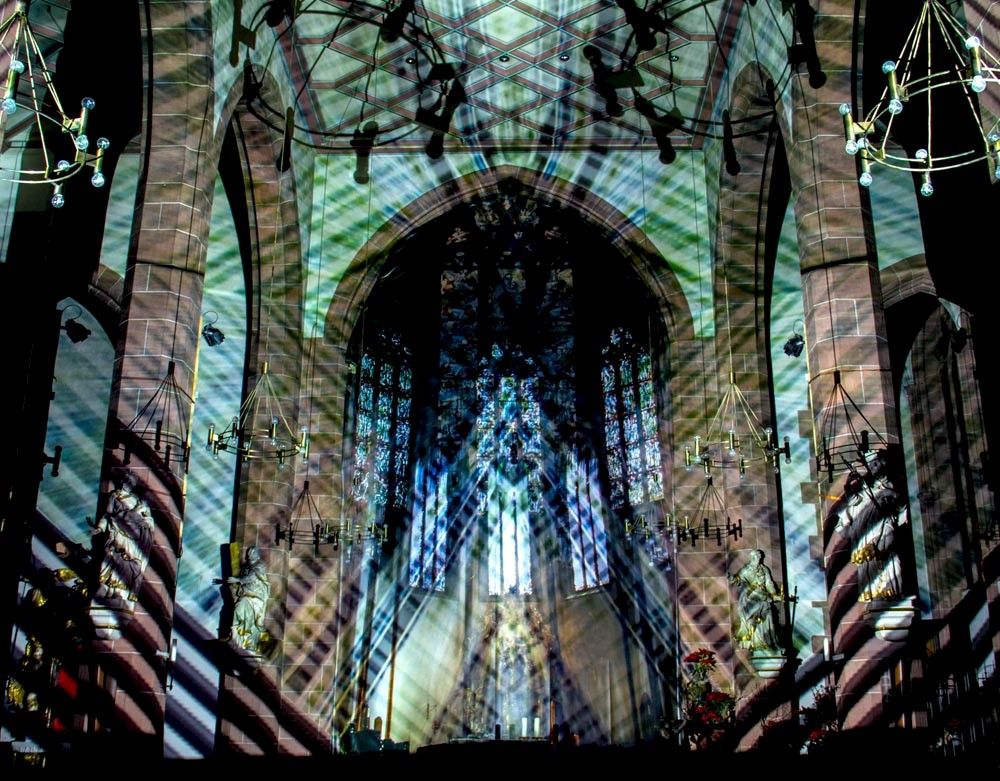 Viennese artist Victoria Coeln creates a polychrome light space in St. Catherine's Church using analogue means. Fabian Thiele takes the start of construction of the Eiserner Steg 150 years ago as an occasion for a typo installation with a poem by the Frankfurt dialect poet Friedrich Stoltze.