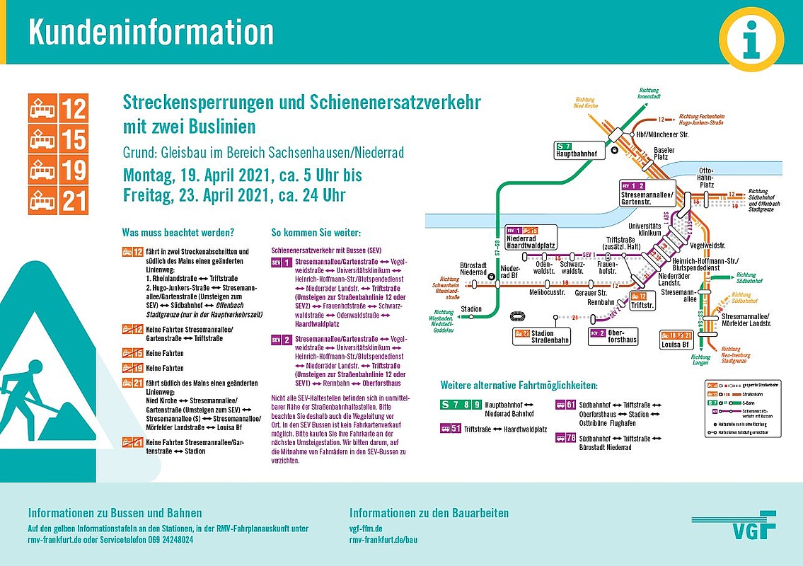 Die Linie 12 verkehrt auf ihrem westlichen Abschnitt von Schwanheim Rheinlandstraße bis Triftstraße und zurück. Im östlichen Abschnitt fährt sie zwischen Hugo-Junkers-Straße und Stresemannallee/Gartenstraße. Ab dort ersetzt sie die Linie 15 Richtung Südbahnhof und Offenbach Stadtgrenze. Die Linie 21 verkehrt von Nied Kirche bis Stresemannallee/Gartenstraße und wird dann nach Louisa Bahnhof umgeleitet. Die Linien 15 und 19 werden im oben genannten Zeitraum nicht fahren.