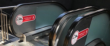 Die Handläufe zweier Fahrtreppen zur S-Bahn-Verteilerebene werden durch UV-C- Lichtbestrahlung desinfiziert. Die in den letzten beiden Tagen installierte Technik kommt mit dem Frankfurter Hauptbahnhof erstmalig an einem Bahnhof zum Einsatz. Aufkleber weisen auf die sterilen Handläufe hin.