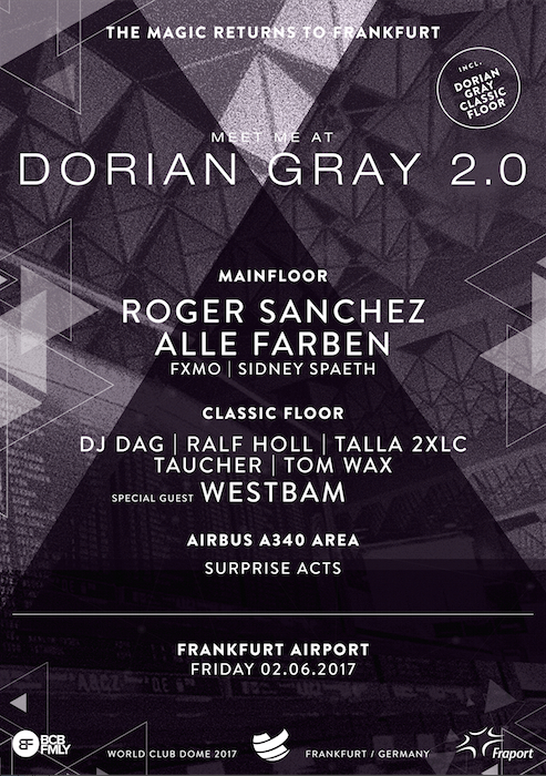 Die letzten zwei Dorian Gray-Events am Frankfurter Flughafen 2015 und 2016 waren ein voller Erfolg, die Karten bereits binnen weniger Stunden ausverkauft. Das Event hat sich seitdem zu einem internationalen Party-Highlight entwickelt. Jetzt geht die Veranstaltung in die dritte Runde und lockt am 2. Juni getreu dem Motto „The Magic Returns For One Night“ des ehemaligen Airport-Clubs Dorian Gray zum Feiern an den Frankfurter Flughafen. Nach dem BigCityBeats WORLD CLUB DOME-Auftakt in der Commerzbank-Arena Frankfurt geht es mit Shuttlebussen über das Flughafengelände direkt zu den in Clubs umgebaute Gates.