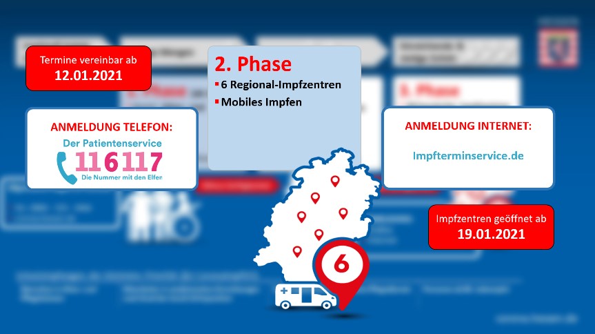 Der Hessische Innenminister Peter Beuth und der Hessische Gesundheitsminister Kai Klose erklärten: „Wir werden die sechs Regionalen Impfzentren ab dem 19. Januar öffnen. Angesichts der überschaubaren Impfstoffmengen werden sie noch nicht unter Volllast laufen, dennoch werden tausende Bürgerinnen und Bürger wöchentlich landesweit ihre Schutzimpfung erhalten können. Sobald eine erhöhte Impfstoffproduktion und weitere Zulassungen für wirksame Impfstoffe in Europa erfolgen, können wir unsere weiteren Impfzentren öffnen. Aktuell hat aber noch der Schutz in den Alten- und Pflegeeinrichtungen sowie für das Personal in den besonders belasteten Krankenhäusern höchste Priorität.“