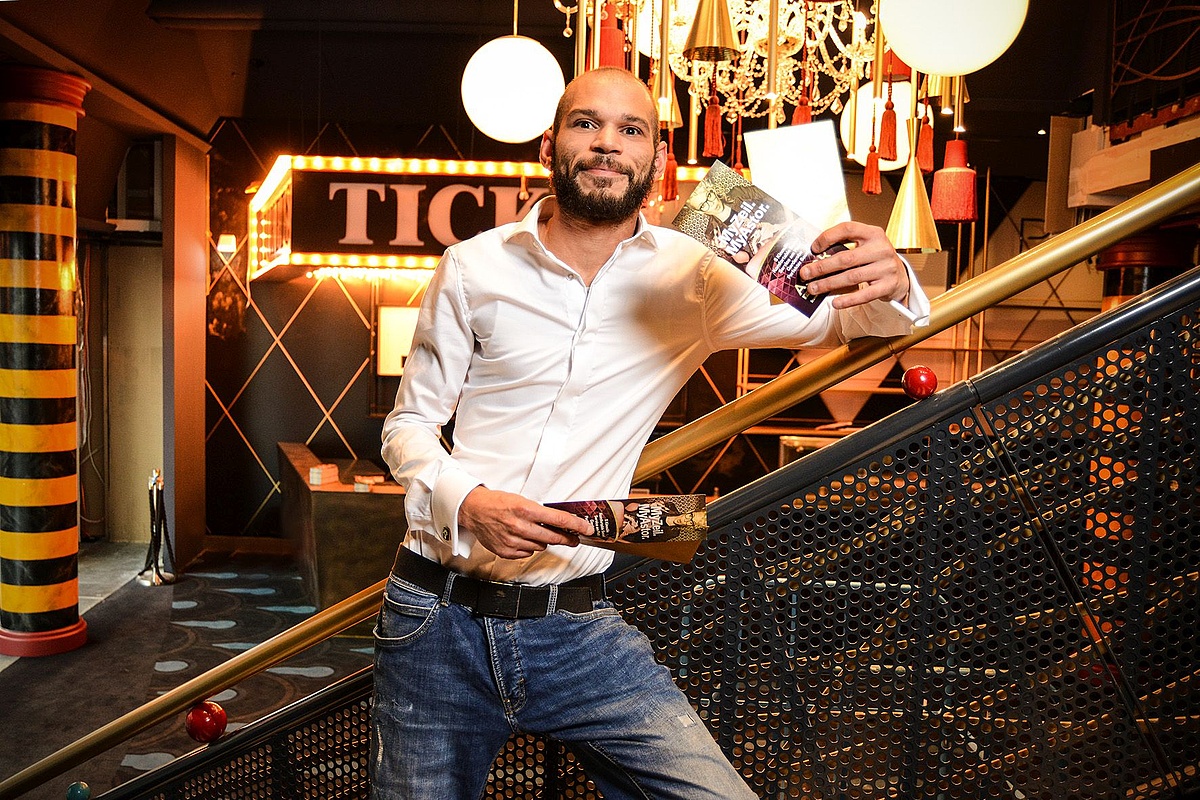 Für die Kampagne „Kleider machen Leute“ schlüpfte er kurz in die Rolle eines Gastes. Mit dunkelgrünem Samtsmoking und schwarzer Samtfliege „lümmelte“ er sich in die erste Reihe, legte seine Füße hoch trank eine Cola und aß genüsslich Popcorn. Fotografiert hat ihn so Daniel Baldus.