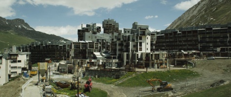 Besonders effektiv ist der Gegensatz in einer Sequenz herausgearbeitet, in der Lang eine in einen Berghang hineingebaute Feriensiedlung mit etlichen nicht gerade attraktiven Wohneinheiten erst im Sommer besucht, wenn hier kaum ein Mensch lebt und das Ganze fast den Eindruck einer Geisterstadt erweckt. Wenig später wandert die Kamera erneut durch die Gassen der Siedlung, jetzt allerdings im Winter, wo hier reges Trieben herrscht, sich Touristen in Scharen in die Ski-Lifte drängen oder laute Après Ski Partys feiern.
