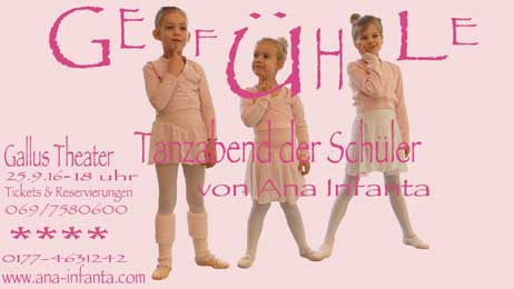 Die Tanzschule "Ana Infanta" zeigt bei uns einen Tanzabend mit Darbietungen der verschiedenen Klassen unter dem Motto "Gefühle". Anfänger bis Fortgeschrittene im Alter von 3-70 Jahren zeigen ihr Können im Bereich Flamenco, Ballett, Pre Ballett und Jazztanz und erzählen dabei tanzend Geschichten über verschiedene Gefühlszustände: