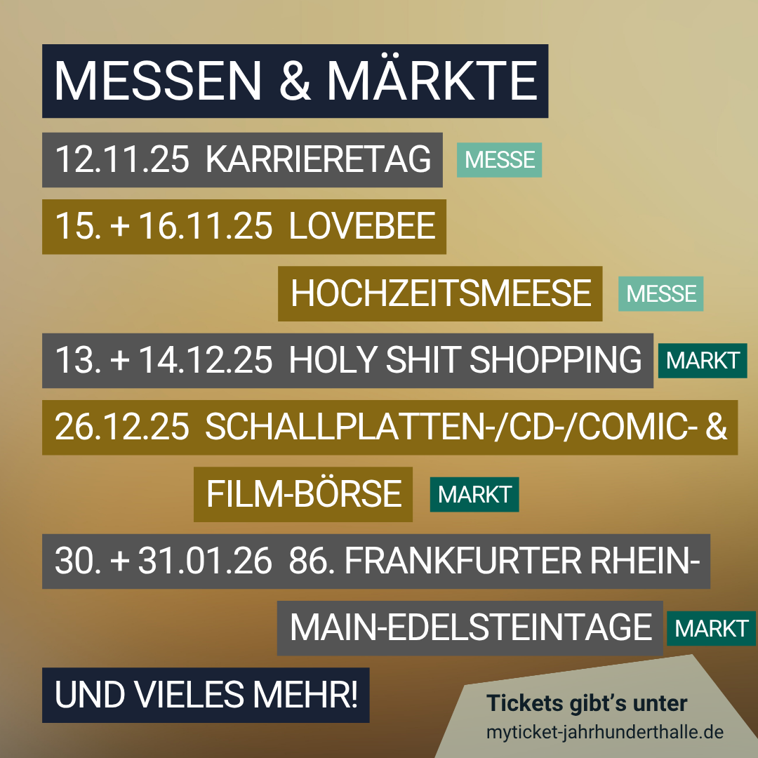 Jimi Hendrix, Janis Joplin, Frank Sinatra, The Doors, Elton John, Louis Armstrong, Santana, die Bee Gees, Kraftwerk, a-ha, Sting, Woody Allen, Katy Perry, Rihanna, Coldplay - es ist kaum zu glauben, welche Größen der Rock- und Pop-Geschichte seit 1963 auf der Bühne der myticket Jahrhunderthalle standen. Bis heute ist das Haus mit über 300 Veranstaltungen und ca. 1.000.000 Besucher:innen pro Jahr eine der größten privaten Kulturinitiativen Europas. Neben dem großen Kuppelsaal bietet die myticket Jahrhunderthalle noch weitere Veranstaltungsräume. Der CLUB als kleine Spielstätte des Hauses und das Kasino mit seinen Messen & Märkten im Erdgeschoss der Jahrhunderthalle und die Sommerwiese als Open Air Areal mit Festival Feeling auf der grünen Wiese.