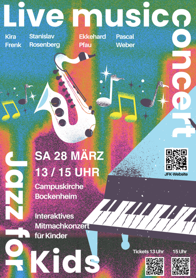 Jazz For Kids sind interaktive Konzerte, die Kindern ab 3 Jahren den Jazz als Musikgenre spielerisch und mit viel humorvollen Anekdoten näher bringen. Das Programm mit Live-Gesang, Klavier, Schlagzeug und Saxofon nimmt Kinder mit auf eine Reise mit dem Chattanooga-Express zu den Ursprüngen des Jazz voller schöner Songs, authentischer Kostüme und passend illustriert. Ein Erlebnis für Jung und Alt, für ein entspanntes Wochenende auf der Sonnenseite des Lebens!