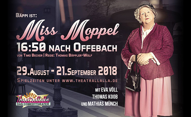 Es wurde auch Zeit! Eine Idee, vor Jahren geboren, wird endlich Realität: Bäppi als Miss Moppel. Die Anspielungen auf die berühmte Miss Marple aus den Agatha Christie Romanen kommt nicht von ungefähr. Timo Becker hat eine Krimikomödie gezaubert, in der sich Bäppi richtig austoben darf. „Miss Moppel: 16.50 nach Offenbach“ wird ein Glanzlicht im Stil der Krimiparodien.